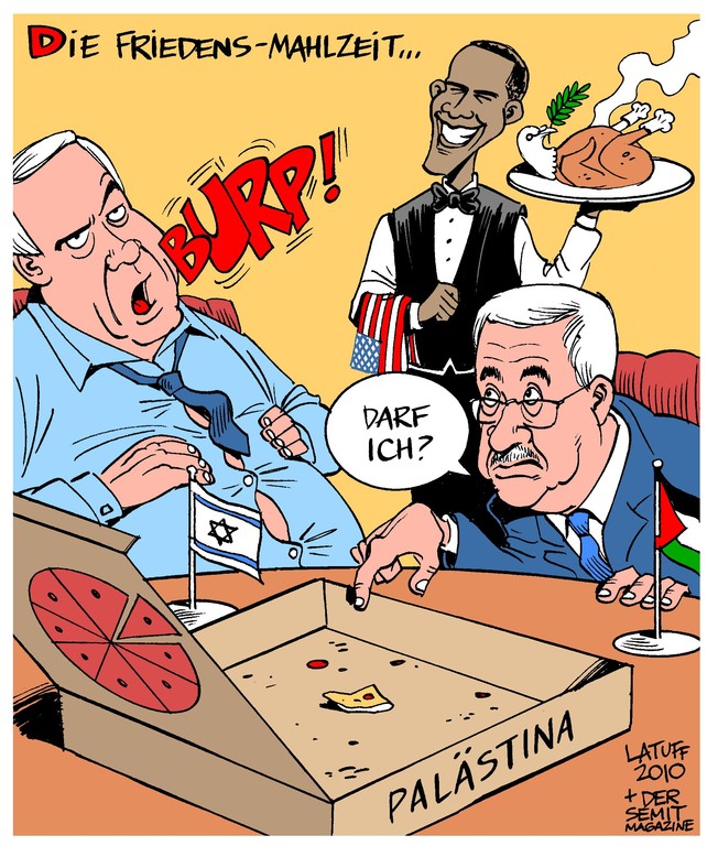 Obama serve a pomba da paz, Benjamin Netanyahu, primeiro-ministro de Israel, arrota de empanturrado e Mahmoud Abbas, presidente da autoridade palestiniana, pergunta: «posso? dá-me licença?»