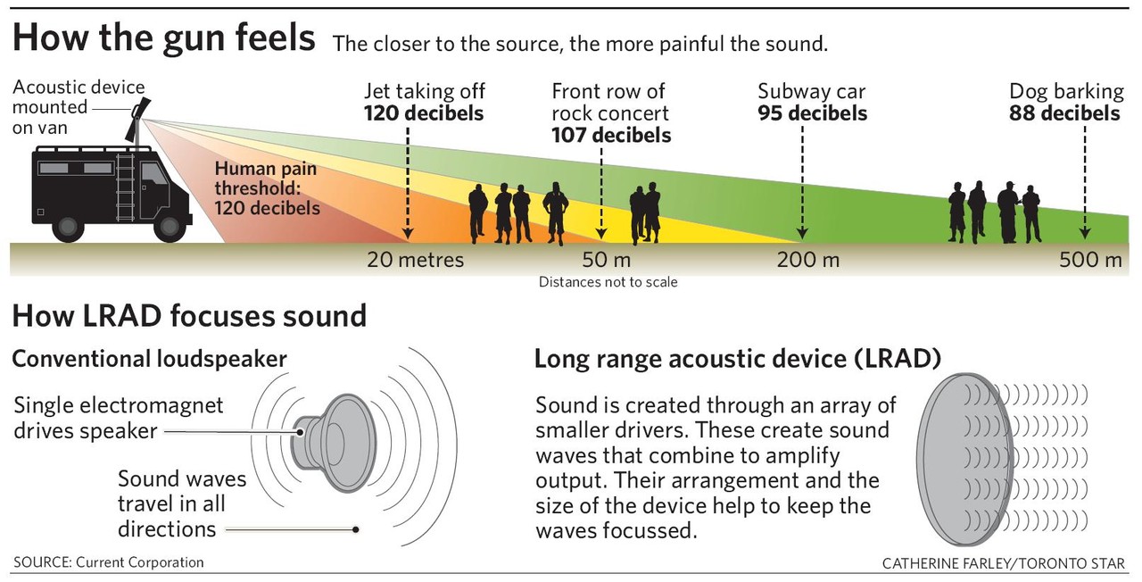 O Aparelho Acústico de Longo Alcance (Long Range Acoustic Device, ou LRAD) desenvolvido pela American Technology Corporation, «concentra e transmite som até distâncias de centenas de metros», de acordo com David Axe no Danger Room da Wired. O LRAD já existe há anos, mas os americanos tomaram primeiro notícia dele quando foi usado pela polícia de Pittsburgh para repelir os manifestantes na Cimeira dos G-20 de 2009. David Hambling diz que é normalmente usado de duas maneiras: «como megafone para dar ordem de dispersão aos manifestantes, ou, em caso de desobediência, como sirene rompe-tímpanos para os afastar.» Se é certo que o LRAD não será mortal, pode provocar danos permanentes no ouvido.