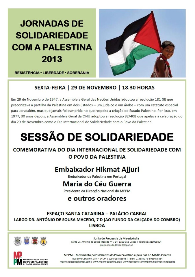 O MPPM (Movimento pelos Direitos do Povo Palestino e pela Paz no Médio Oriente) convida a participar na comemoração do Dia Internacional de Solidariedade com o Povo da Palestina, que se vai realizar no dia 29 de Novembro, pelas 18h,30, no Espaço Sta. Catarina, Largo Dr. António de Sousa Macedo, 7 D (ao fundo da Calçada do Combro) Lisboa.