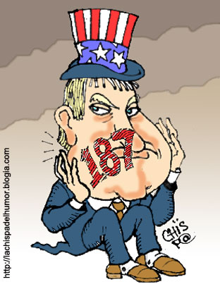 «Ese máximo terrorista que es el imperio me recuerda al ladron que viéndose perdido grita "al ladrón, al ladrón". El departamento de estado de los EE.UU. todos los años hace pública una lista culpando de terroristas a no se cuantos estados y nos incluye a nosotros [cubanos]. Yo, como ciudadano de a pie de este país [Cuba], protesto enérgicamente por esa afrenta. Nosotros SI hemos sido víctimas del terrorismo de los yonis [=yonquis=drogados?] por más de 50 años... Y como ellos acusan falsamente de terroristas hasta al pipisigallo se me ocurrió la caricatura adjunta.»