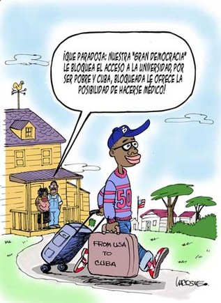 Que paradoxo! A nossa «grande democracia» bloqueia-lhe o acesso à Universidade por ser pobre, e Cuba, bloqueada, oferece-lhe a possibilidade de ser médico!