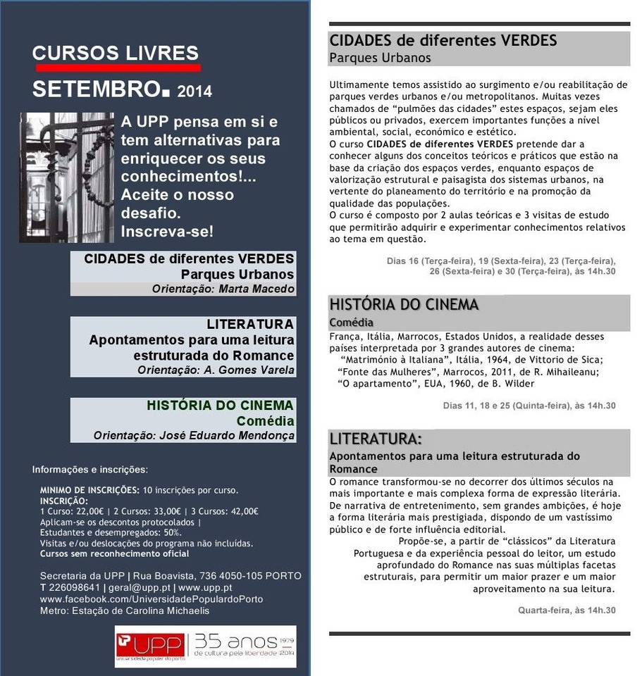UPP: Cursos Livres Setembro 2014 02.09.14 -Clicar na imagem para ampliar-sinto-me: Tags:antónio gomes varelablogblogscastendocinemaculturacursoshoráriosjosé eduardo mendonçaliteraturamarta macedopopularportouniversidadeurbanaverdes publicado às 09:20 link do post comentar favorito