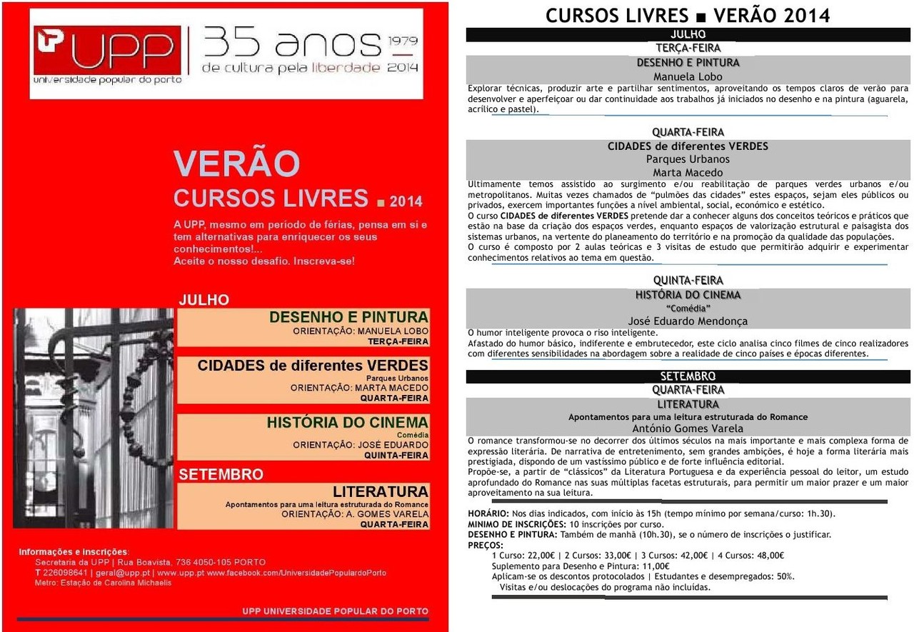 UPP: Cursos Verão 2014 26.06.14 -Clicar na imagem para ampliar-sinto-me: Tags:antónio gomes varelablogblogscastendocinemaculturacursosdesenhohistóriahoráriosjosé eduardo mendonçaliteraturamanuela lobomarta macedoparquespinturapopularportouniversidadeverdesverão publicado às 00:05 link do post comentar favorito