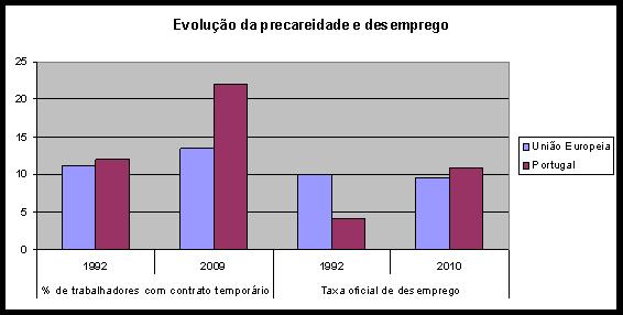 Ao longo das últimas duas décadas, Portugal passou de uma percentagem de trabalhadores com contratos temporários de 12% (em 1992) para 22% (em 2009). No mesmo período a média da União Europeia (UE) subiu de 11,2% para 13,5%.