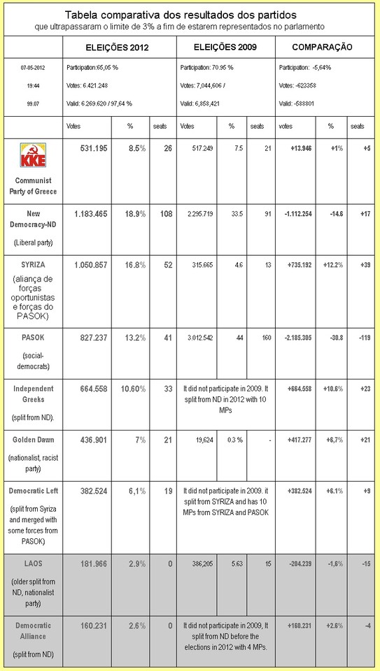 A Grécia continua a atrair a atenção de trabalhadores de muitos países de todo o mundo, considerando as novas e crucialmente importantes eleições parlamentares, as quais serão efectuadas a 17 de Junho, pois nenhum dos três partidos que receberam maior número de votos pôde forma uma coligação de governo. De particular interesse, a julgar pelos artigos relevantes em jornais, revistas e sítios web comunistas e progressistas, estão os resultados das eleições recentes bem como a linha política traçada pelo Partido Comunista da Grécia (KKE), o qual ficou na linha de fogo de vários analistas neste período. Mas vamos começar pelo começo.