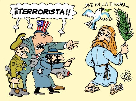 «Ese máximo terrorista que es el imperio me recuerda al ladron que viéndose perdido grita "al ladrón, al ladrón". El departamento de estado de los EE.UU. todos los años hace pública una lista culpando de terroristas a no se cuantos estados y nos incluye a nosotros [cubanos]. Yo, como ciudadano de a pie de este país [Cuba], protesto enérgicamente por esa afrenta. Nosotros SI hemos sido víctimas del terrorismo de los yonis [=yonquis=drogados?] por más de 50 años... Y como ellos acusan falsamente de terroristas hasta al pipisigallo se me ocurrió la caricatura adjunta.»