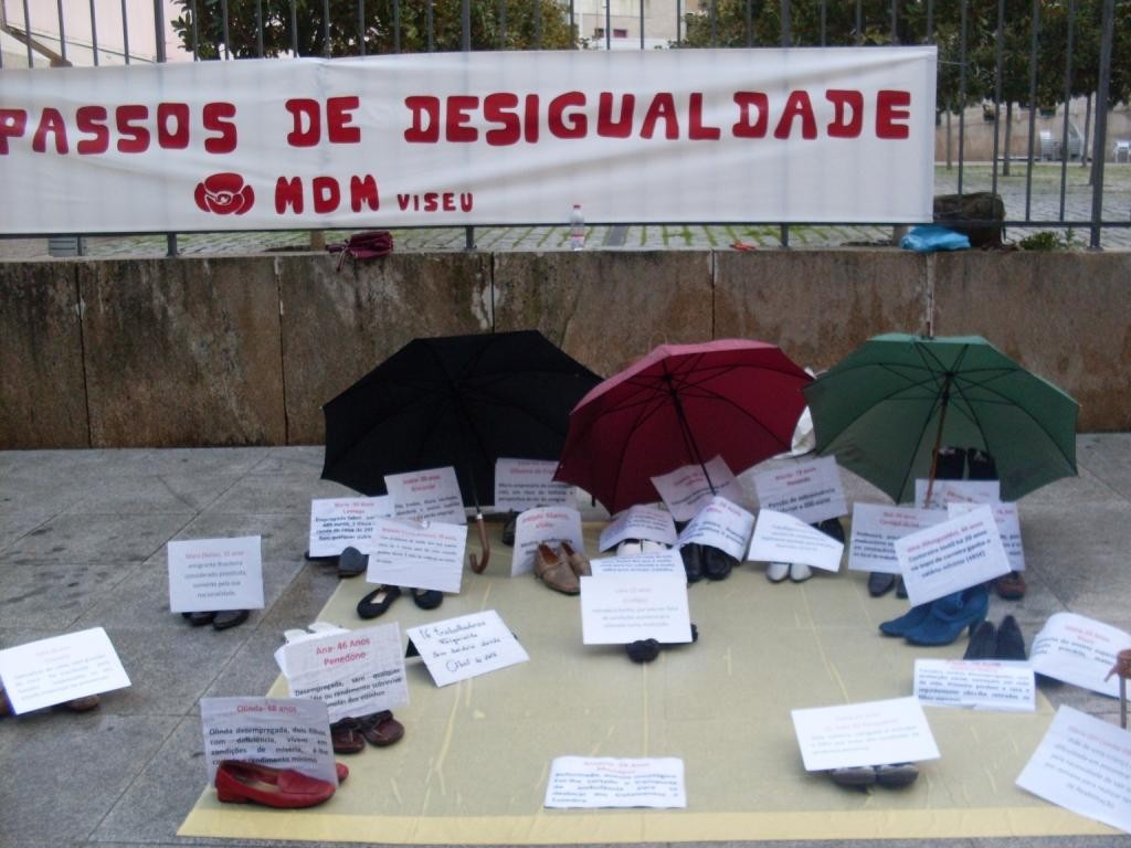 Muitos foram as mulheres e os homens que percorrendo a Rua Formosa, foram surpreendidos pela acção dinamizada pelo Núcleo de Viseu do MDM. A curiosidade deteve quantos ali passavam perante uma inusitada exposição de pares de sapatos. Cerca de trinta pares de sapatos femininos, colocados sobre um fundo amarelo, ganharam rosto para dar visibilidade a situações reais de mulheres que vivem no nosso Distrito. Entre a pobreza, o desemprego, a precariedade, a dificuldade no acesso a cuidados de saúde, a impossibilidade de aceder a apoios sociais e a violação de direitos específicos às mulheres se fez a denúncia da profunda degradação das condições de vida a que tem conduzido a austeridade, em Passos de Desigualdade que é preciso denunciar.